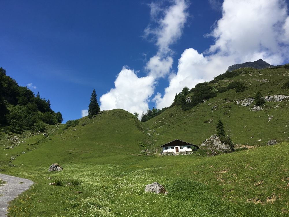 Hier gehen wir westwärts auf dem Pfad weiter und nach rund 250m nicht rechts bergauf, sondern verlassen hier den Wilder-Kaiser-Steig und gehen gerade weiter zur Granderalm.