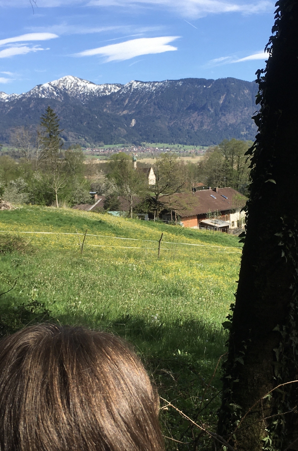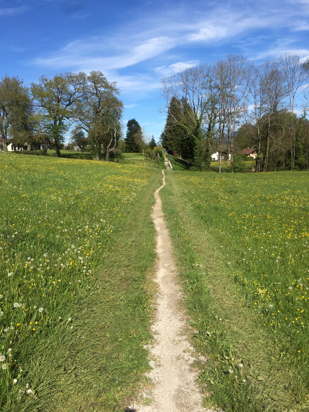 Wir gehen zur Geländekante hinter dem Restaurant und dort links zum Drachenstich, einer kleinen Schlucht mit Wasserfall. Hier erklimmen wir die Hangkante auf dem leichten Weg und biegen oben noch vor den Gleisen nach rechts auf den Weg, der uns aus dem Wald und über die Wiesen nach Osten führt. Wir erreichen Murnaus südwestlichste Häuser, die wir auf den Wohngebietsstraßen umgehen, indem wir kurz links auf der Teerstraße und dann zweimal rechts um die Häuser herumgehen. Am Ende der Teerstraße geht es wieder auf einen kleine Weg unter Bäumen der uns rechts haltend wieder vor zur Hangkante führt.