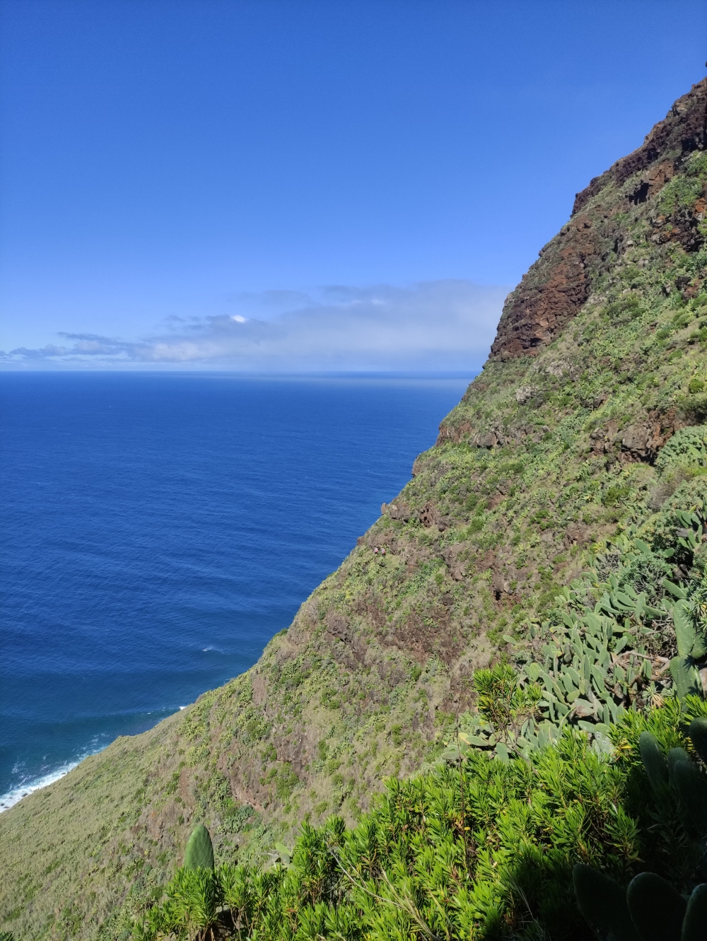 Der Aufstieg führt und zunächst in sehr direkter Linie durch und über die Mauerbegrenzungen, schwenkt kurz nach rechts und führt wieder gerade aufwärts. So gewinnen wir schnell an Höhe. Im oberen Verluf geht es in einem westlichen Bogen durch die Kakteen und schließlich zum breiten Weg oben an der Klippe, dem wir zurück zum Ausgangspunkt folgen.