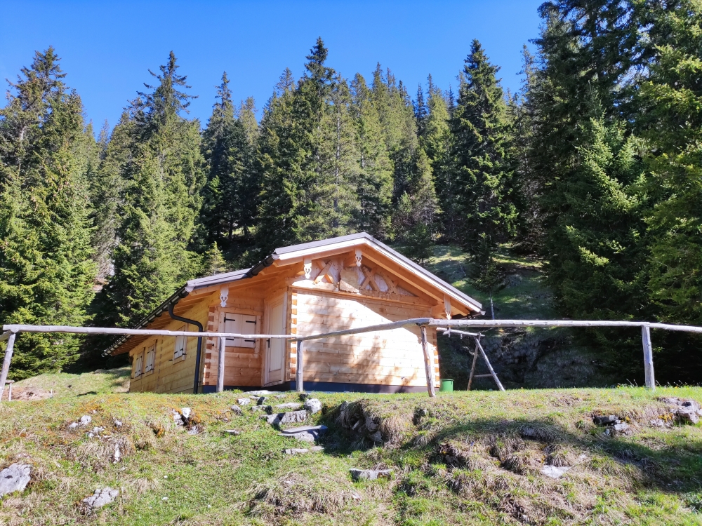 Zurück am Friederspitz steigen wir auf dem Anstiegsweg wieder zum Wegweiser ab und gehen nun rechts über den schwach im Gras erkennbaren Weg der uns am Lausbichl vorbei im Bogen um das Scharfeck herum und hinab ins Friedergries führt.