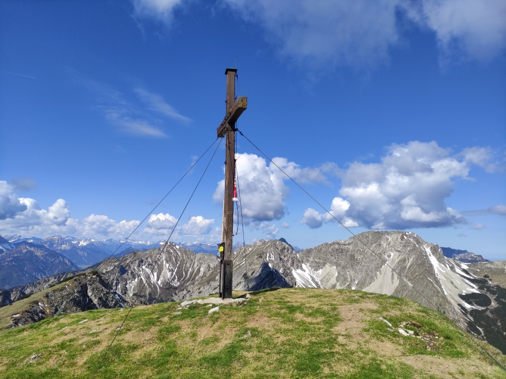 Wer Lust hat steigt rechts hinter dem Gipfelkreuz nochmals rund 80m ab und dann wieder auf zum 4m höhern Gipfel des Frieder.