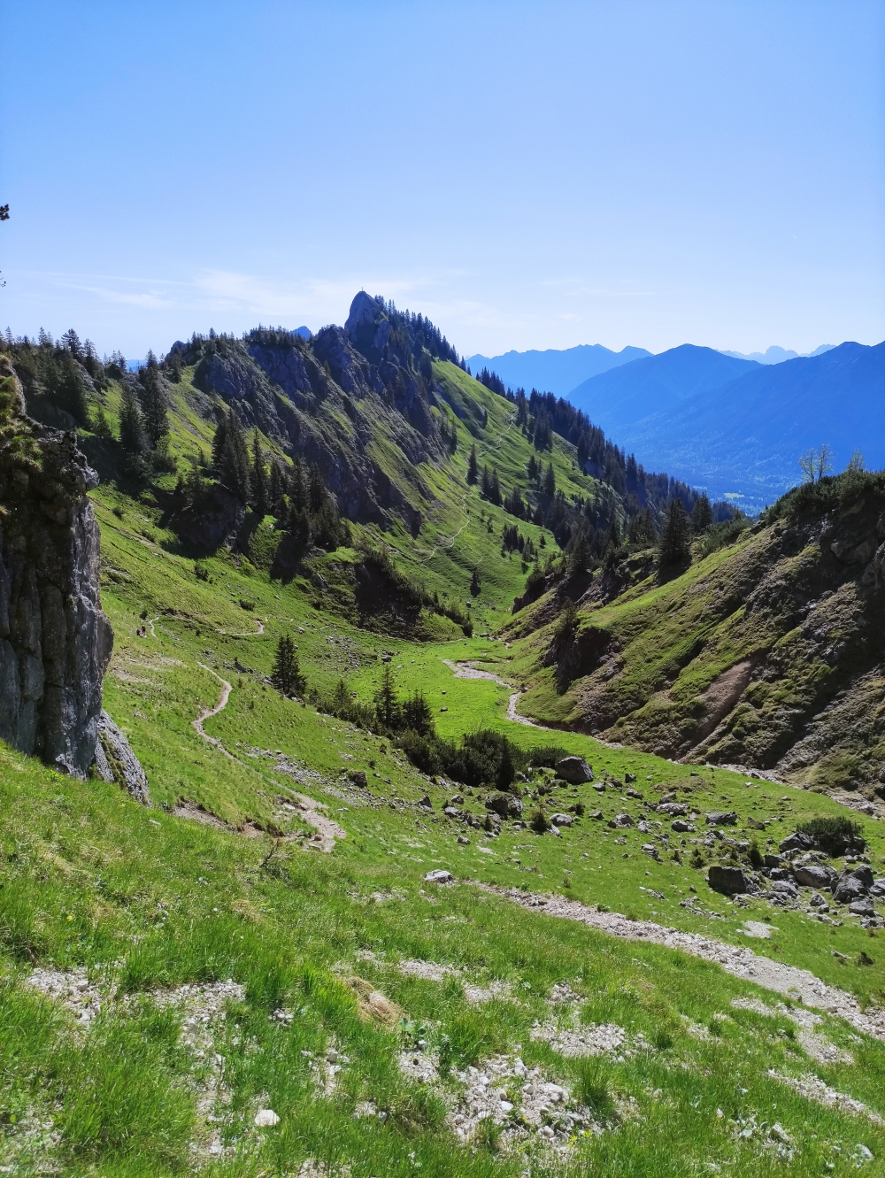 Im Anschluss geht es auf der Westseite wieder bergab und dann über ein ein paar leicht ausgesetzte Stellen auf einem schamlen Weg oder Felstritten hinüber zum Feigenkopf. Kraxelig wird es nur an einer kurzen Seilpassage bevor man dann wieder einige Höhenmeter zum Feigenkopf aufsteigt.