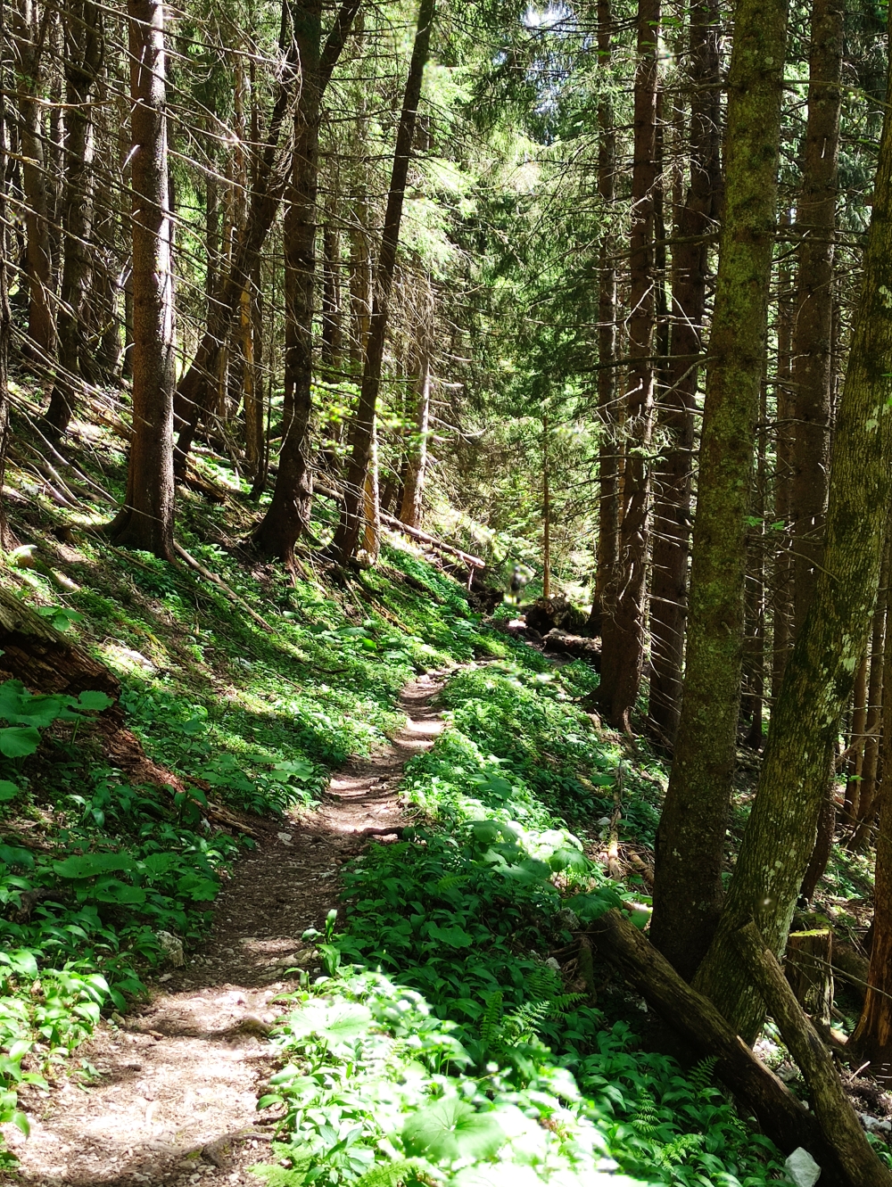 Im Bäckenalmsattel beim historischen Grenzstein gehen wir links und durch das Sägertal, das zunächst lieblich, später monoton daherkommt, zurück.