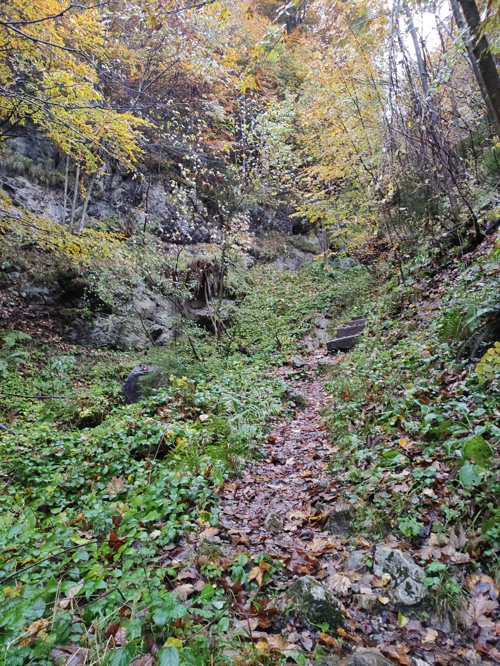 Der Forststraße durch den Bergwald im Tiefentalgraben folgend erreichen wir an deren Ende einen Weg, der in Serpentinen an einem Wasserfall voerbei weiter bergauf führt.