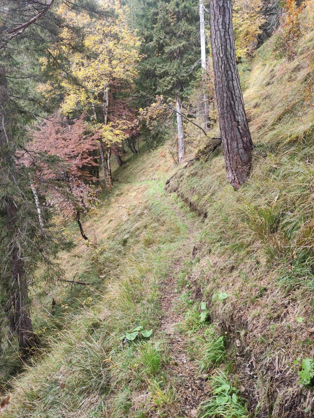 Etwas weiter unten und näher am Ettaler Sattel erreichen wir einen etwas breiteren, horizontal verlaufenden Weg, dem wir nun nach rechts folgen.