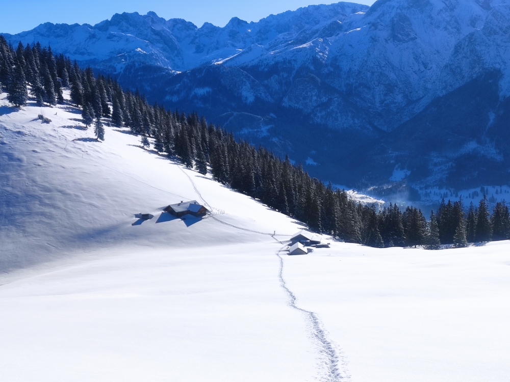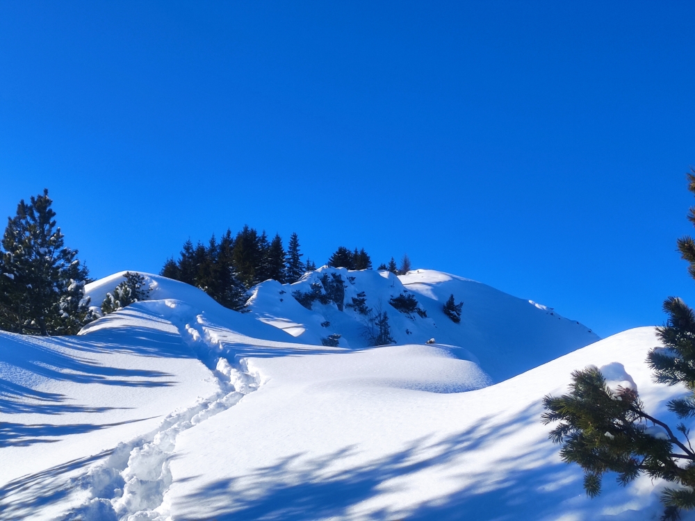 Im Abstieg geht es wieder auf dem Rücken etwas zurück und dann dort wo im Sommer der Steig heraufkommt in der Direttissima zurück zur Stepbergalm.