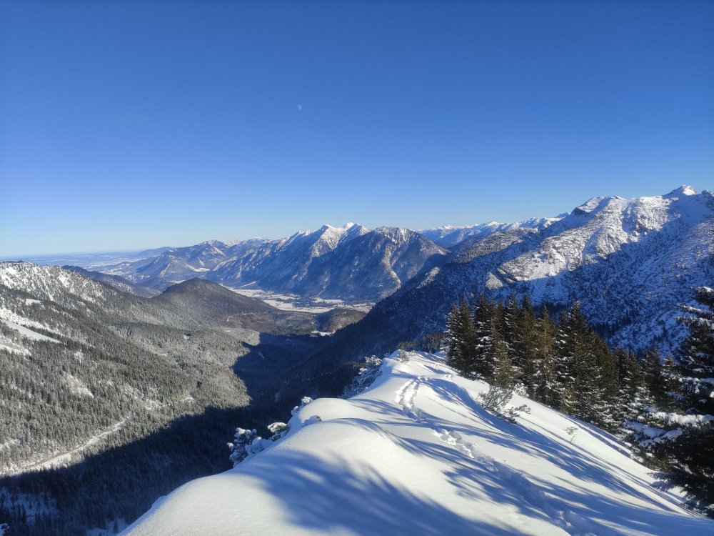 Im Sommer kann man hier direkt gerade weiter zum Hirschbichel aufsteigen, im Winter gehen wir mit Schneeschuhen rechts Richtung Enning-Alm bis wir den Hirschbergrücken erreichen. Über den Rücken geht es nun zum Gipfel.