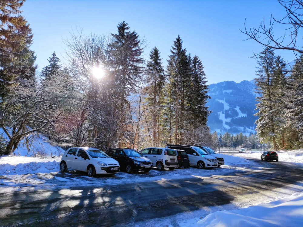 Noch vor dem Parkplatz Maximilianshöhe beim Gasthaus Almhütte befindet sich rechts auf der Anfahrtsstraße ein kleiner, kostenloser Parkplatz "6-24 Uhr". Hier parken wir und gehen gegenüber auf der Forststraße zum Kramerplateauweg, folgen der Straße noch durch zwei Kehren weiter bergauf und zweigen dann am Wegweiser rechts auf den Karrenweg ab.