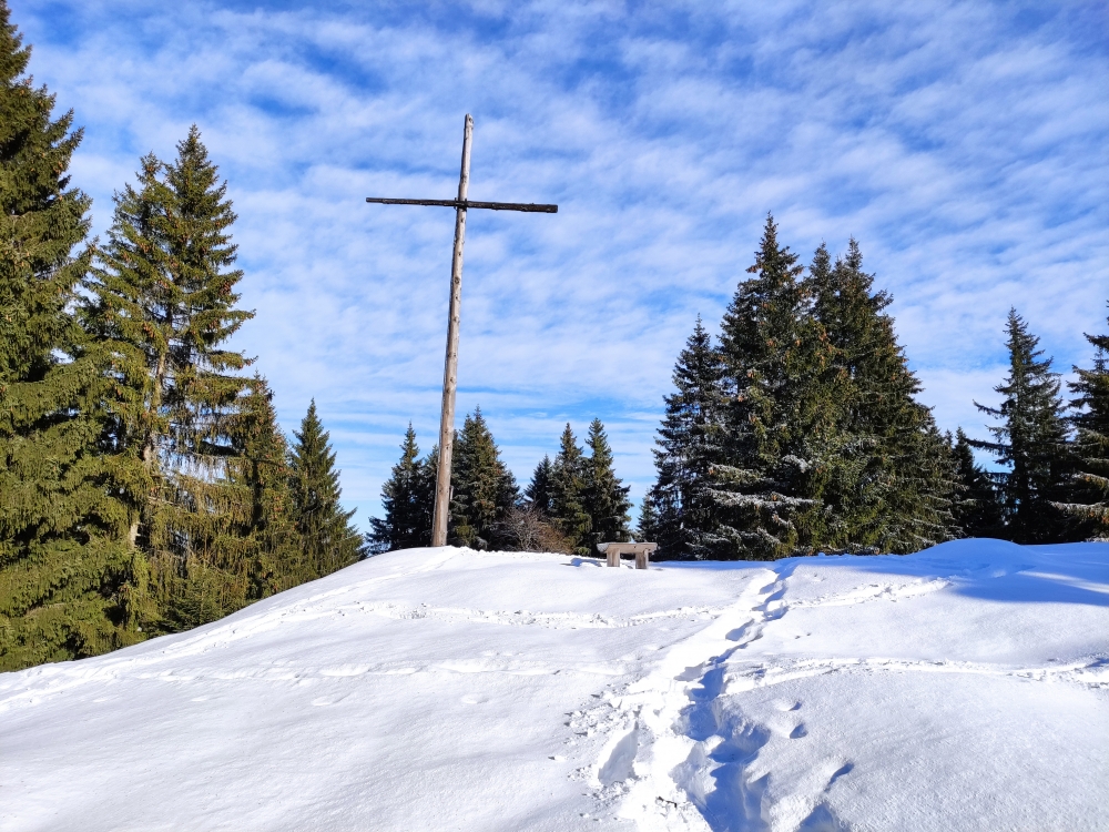 Viel Platz und eine Bank am Gipfelkreuz laden uns hier zur Rast ein - die Aussicht beschränkt sich jedoch auf nur ein paar wenige durch die Bäume spitzende Gipfel.