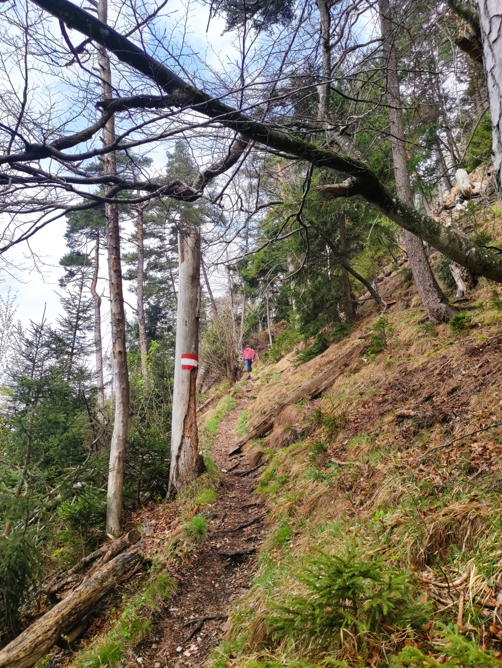 Am oberen Rand der Wiesen erreichen wir ein Forststraße, der wir kurz nach rechts folgen und dann gleich wieder links abbiegen. Schon bald erreichen wir den kleinen Kranzhornsteig, der uns hinauf zum Schutzhaus und Gipfel am Kranzhorn führt.