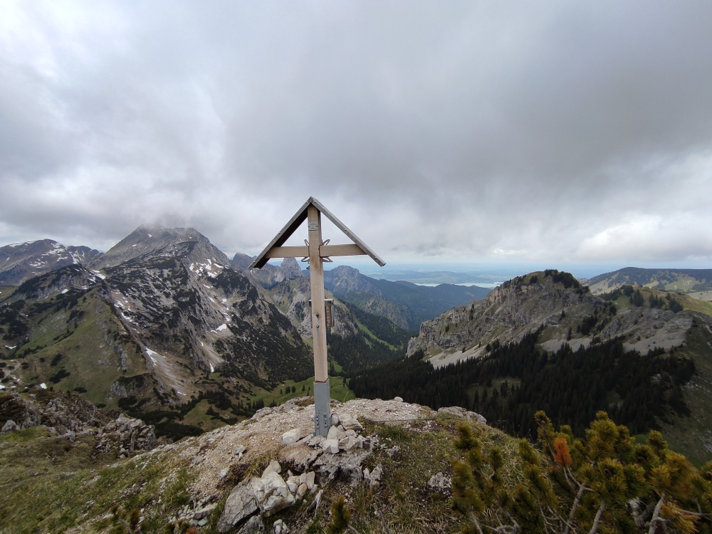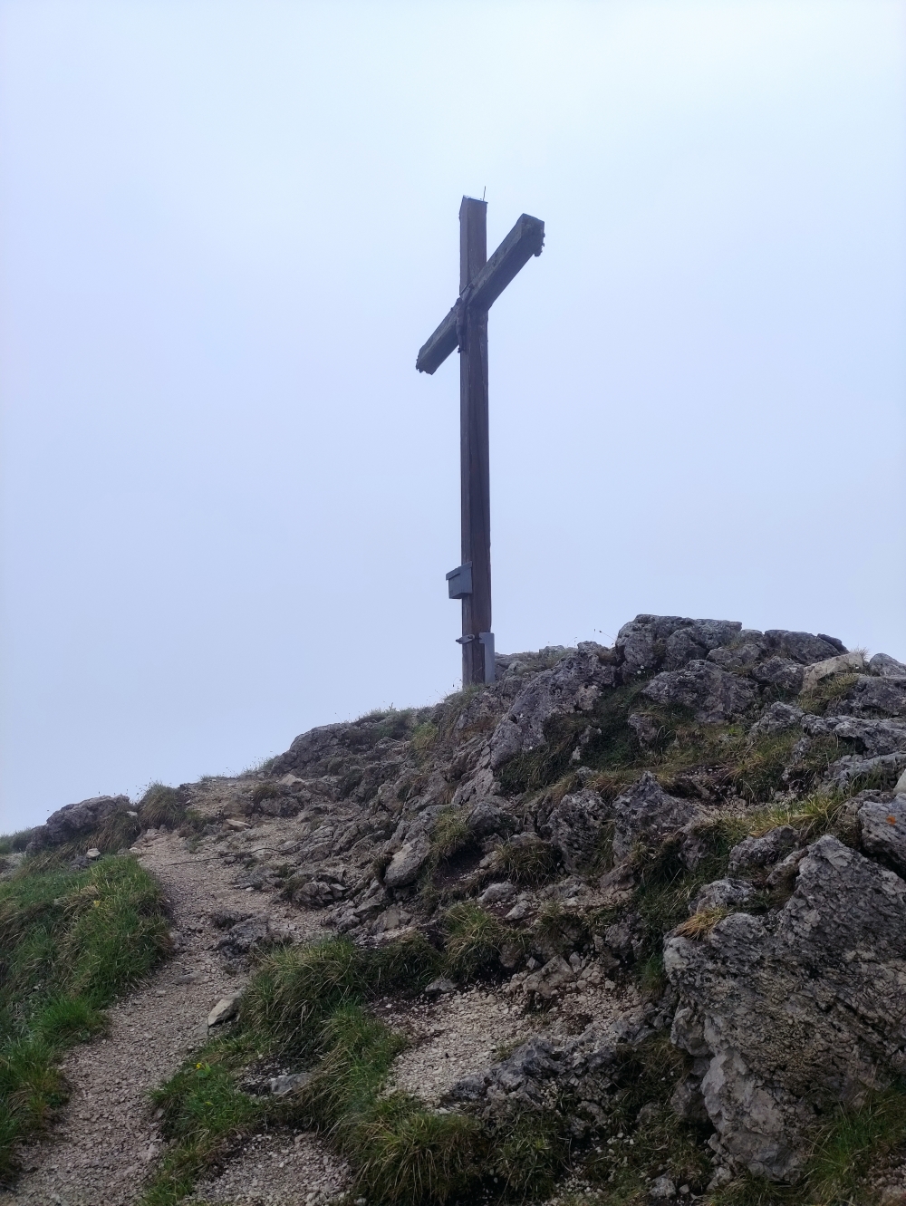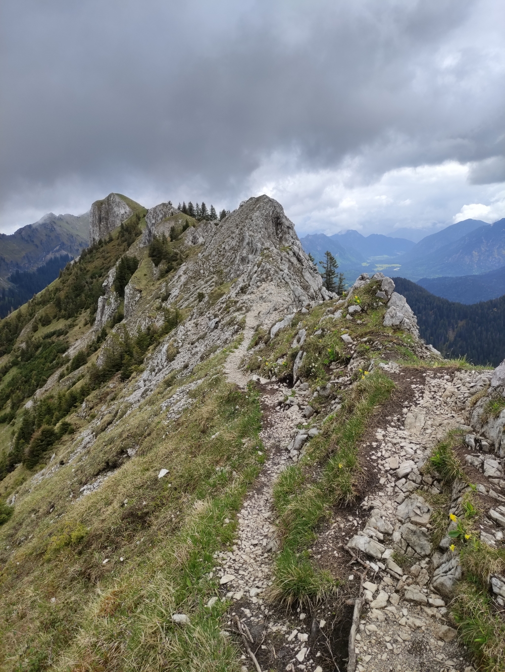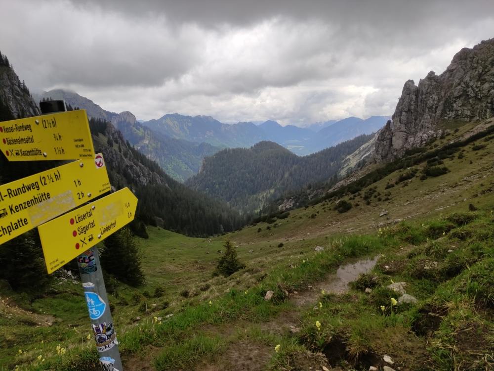 Kurz vor dem Gipfelkreuz leitet uns ein Wegweiser nach rechts und wir erreichen in einem Bogen die Hirschwanghütte. Hier geht es nach links zur Geländekante und über ein paar selversicherte Meter und dann normal bergab und in den Bäckenalmsattel.