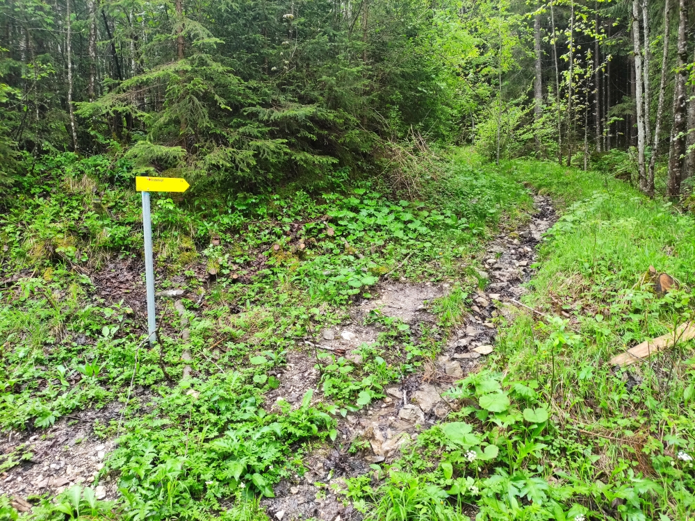 Wenige Meter folgen wir der Schotterstraße und gehen beim nächsten Wegweiser rechts.
