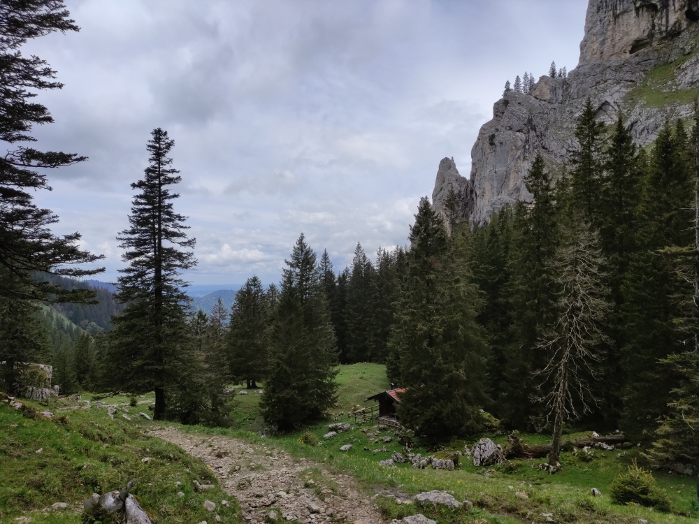 Vom Joch folgt man dem Wegweiser nach Westen bergab zur Scheinbergalpe und dann auf dem Forstweg weiter zur Kenzenhütte.