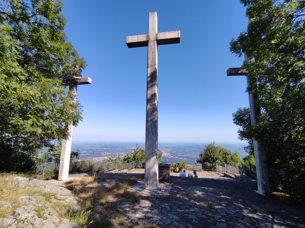 Wer will kann zu der wenige Meter tiefer gelegenen Osteria absteigen und von dieser oder direkt von hier zu den drei Kreuzen auf dem Monte Tre Croci gehen.