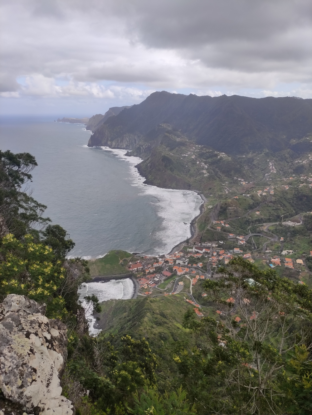 Wir überschreiten den Gipfel und gehen nun in südöstlicher Richtung am Grat entlang abwärts bis zu einer Gabelung. Hier geht es später rechts - zuvor gehen wir aber geradaus weiter am Grat entlang zu einem der Punkte mit schönem Tiefblick auf die Bucht von Porto da Cruz.
