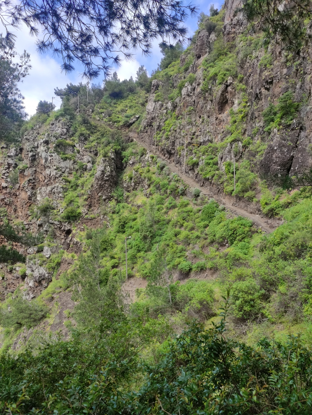 Wir erreichen die Schnellstraße VE1, überqueren diese und gehen nun die steilen Treppen auf der anderen Seite aufwärts. Der Weg führt entlang der Lichtmasten über die Geländekante hinauf zur kleinen Siedlung am Hang des Penha de Aguia über Faial. Oben angekommen gehen wir links wenige Meter abwärts zum Wendehammer und folgen dann der Teerstraße bis zu einer Sachgasse, die nach rechts steil bergauf geht. Nach rund 75m gehen wir rechts weiter steil bergauf und in der Kurve geradeaus auf den erdigen Pfad.