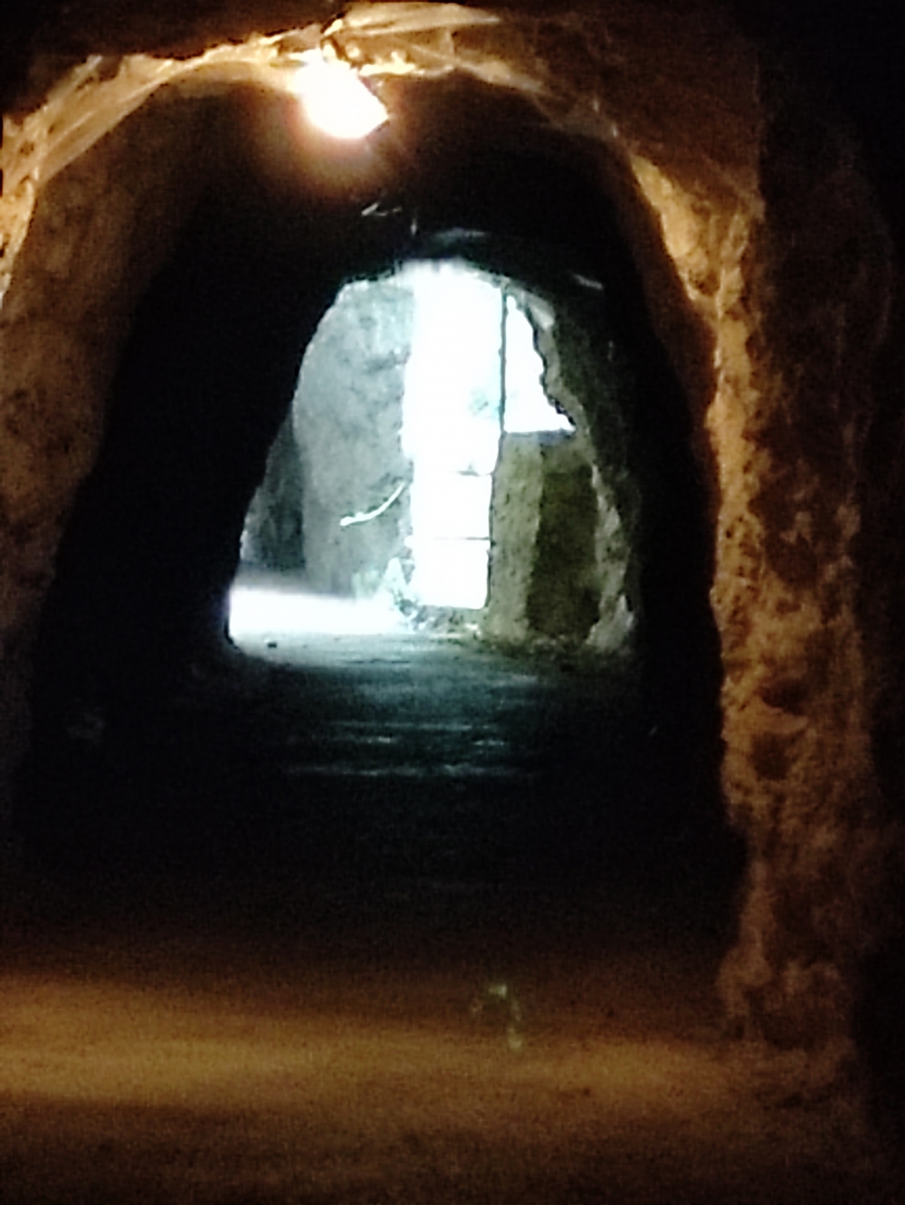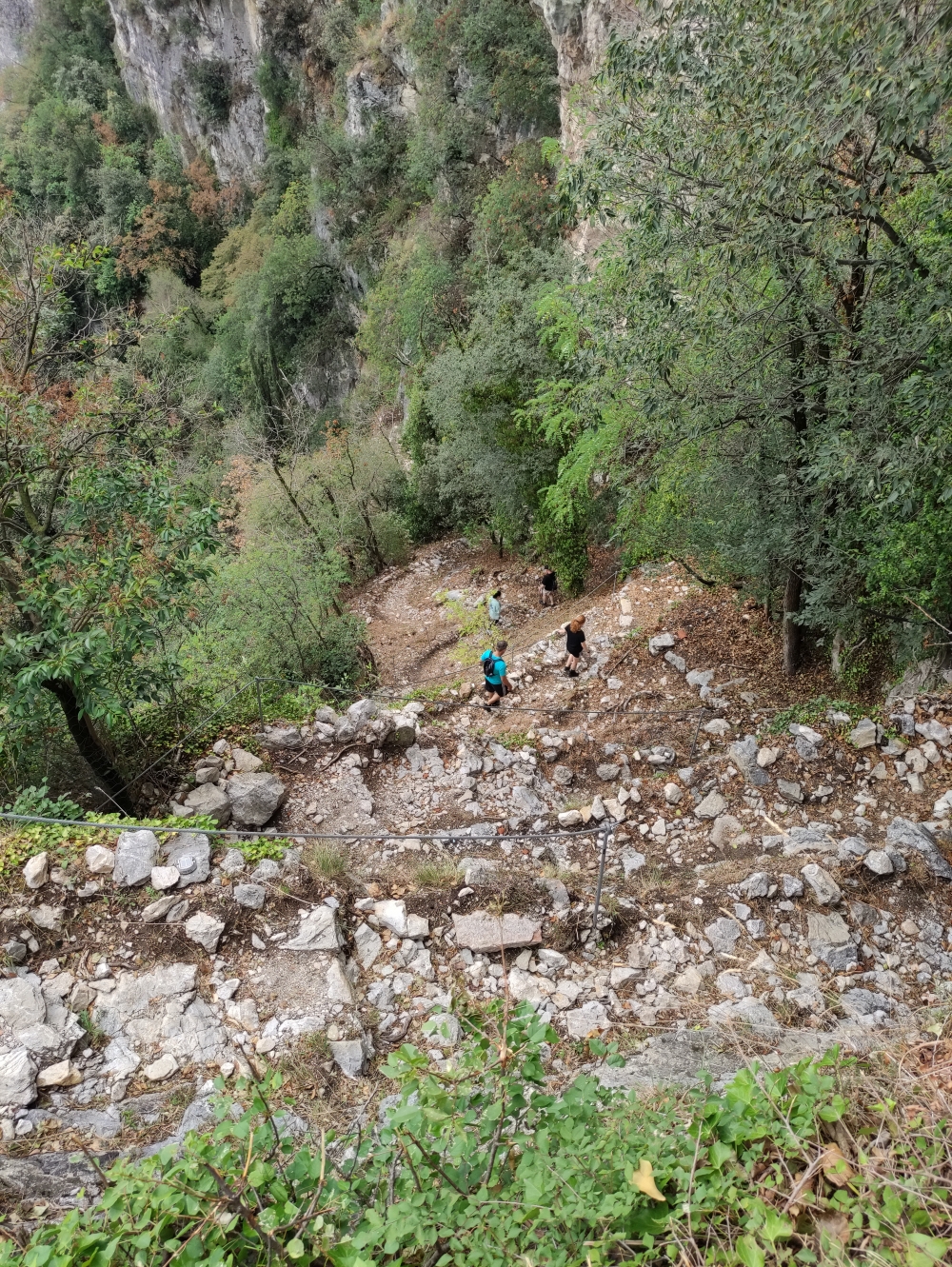 Zurück geht es nun über Stufen zum alten Wasserleitungstunnel in der Schlucht Torrente San Michele. Wir wechseln erstaunlich unspektakulär auf die andere Schluchtseite und gehen über einen ausreichend breiten aber dennoch für kleine Kinder doch etwas zu ausgesetzten Weg der in die Felswand geschlagen wurde.