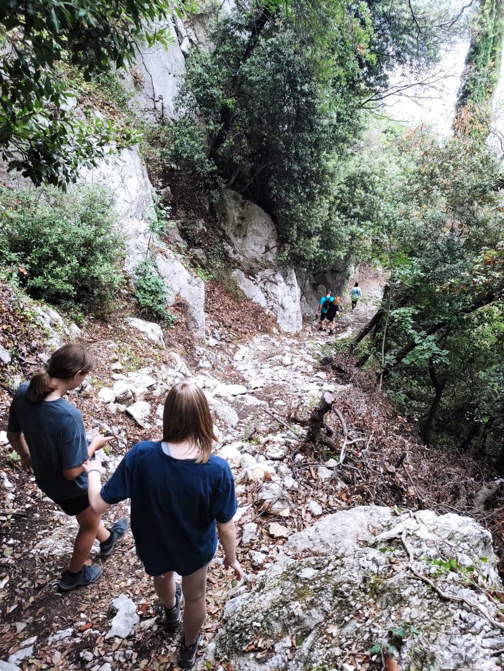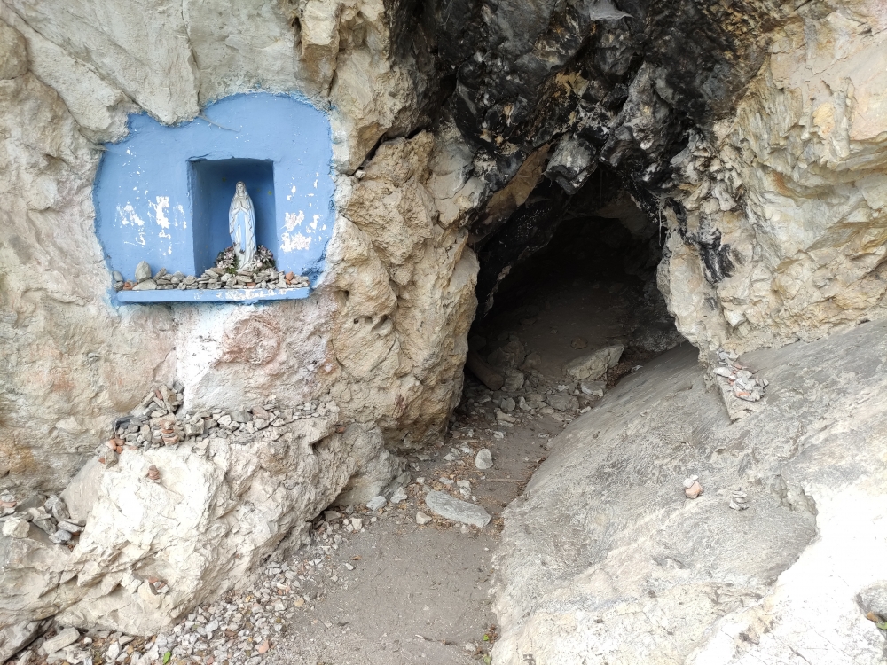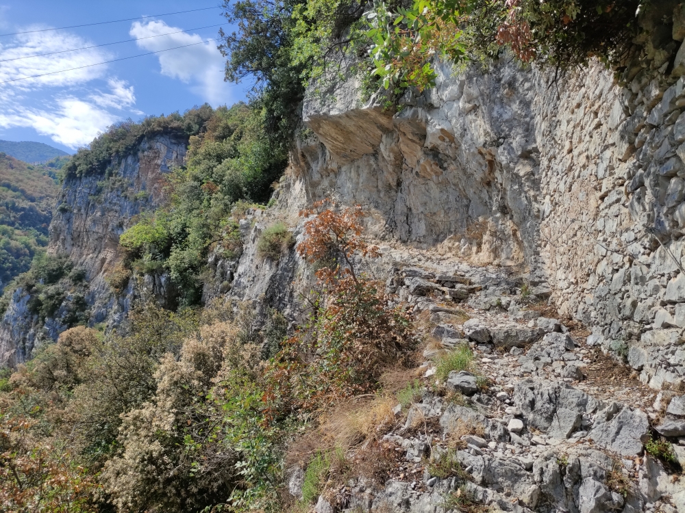Vorbei an der Grotte geht es Steil begrab zur alten Küstenstraße. Auf dieser stillgelegten Piste gehen wir zur Straße, die nach Tremosine hinauf führt und gehen hier ein paar Meter am Straßenrand der nicht viel befahrenen Straße bis zur Kehre, wo wir diese wieder verlassen. Weiter auf der nun geschotterten alten Straße nach Campione.