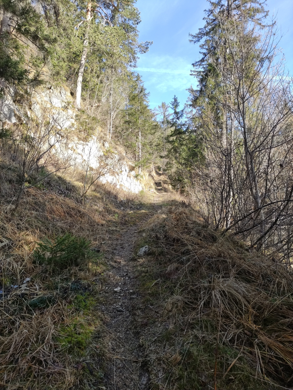 Direkt nach der Wildfütterung rechts auf den schmalen Weg der nun steil und schmal zügig zur Postalm hinauf führt.