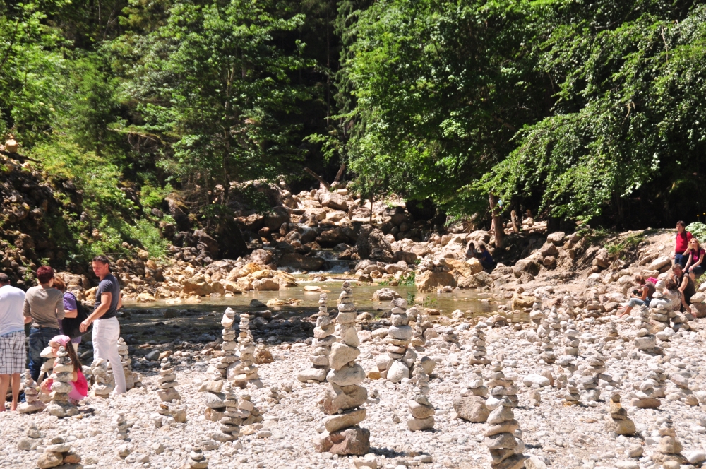 Wir folgen der Beschilderung zur Schlucht und umrunden Schloss Neuschwanstein nordseitig, Auf Stegen und Treppen geht es dann rückseitig durch die Pöllatschlucht leicht an der tosenden Pöllat entlang. Auf der großen Kiesbank können Kinder noch etwas spielen und weitere Steinmännchen bauen, bevor ein Steig hoch zu einem breiten Wanderweg beim Schloss führt. Nach rechts gehend erreichen wir das Schloss. Nach links gehen wir im Anschluss noch bis zur Marienbrücke über dem Pöllatfall, um den besten Blick auf Schloss Neuschwanstein zu haben.