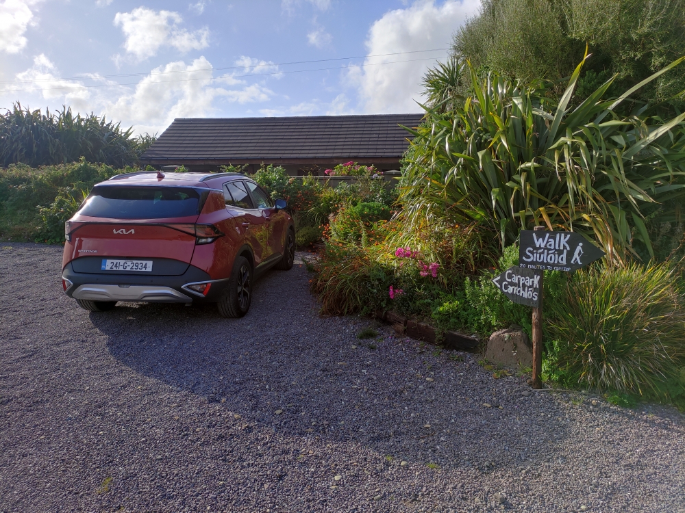 Auf einem Privatgrundstück wurde ein kleiner Parkplatz eingerichtet, den man gegen Spende benutzen darf. Ein Schild weist den Weg auf den richtigen Pfad, der nun um ein paar Weiden herum zur Klippe führt.