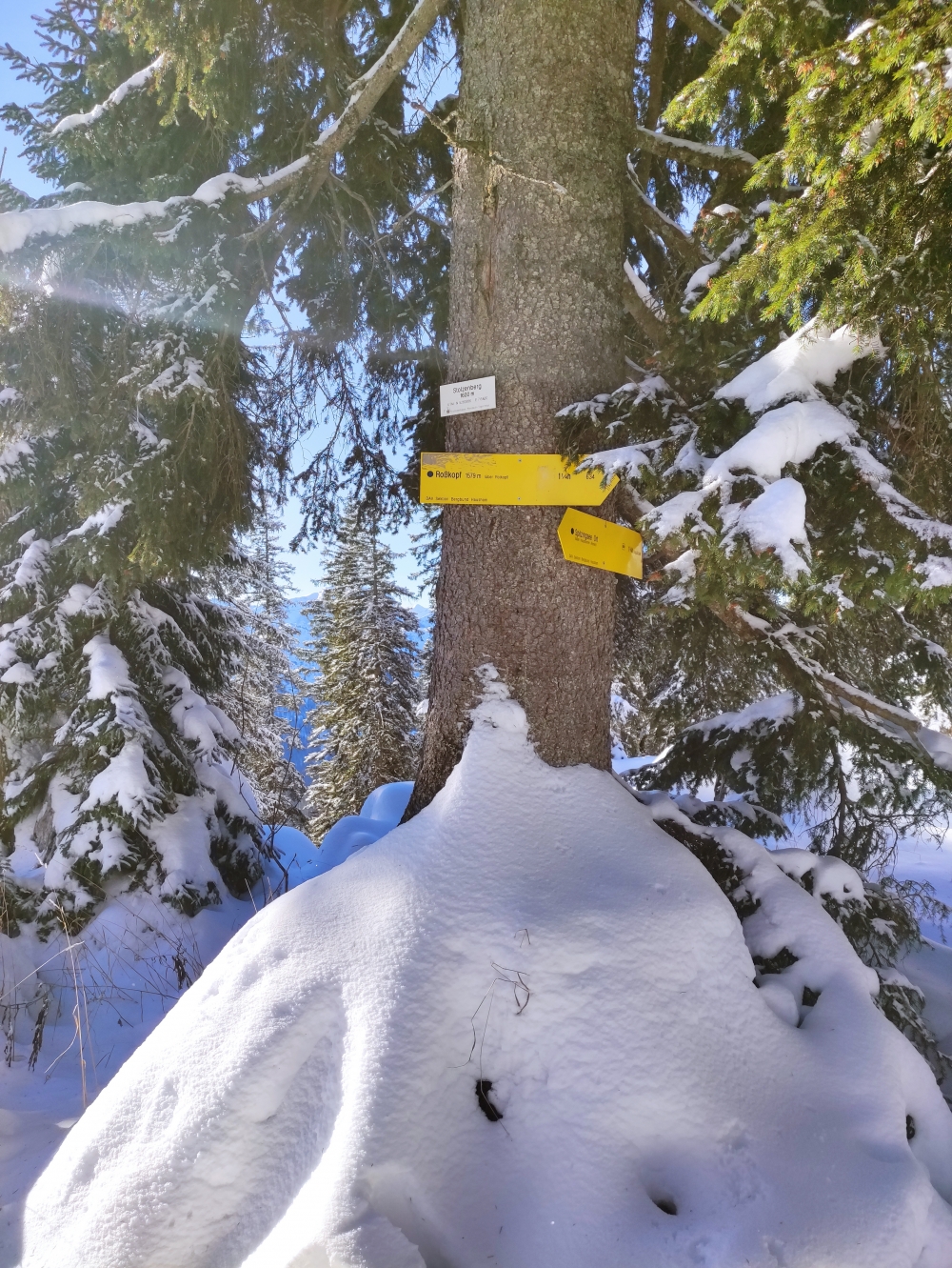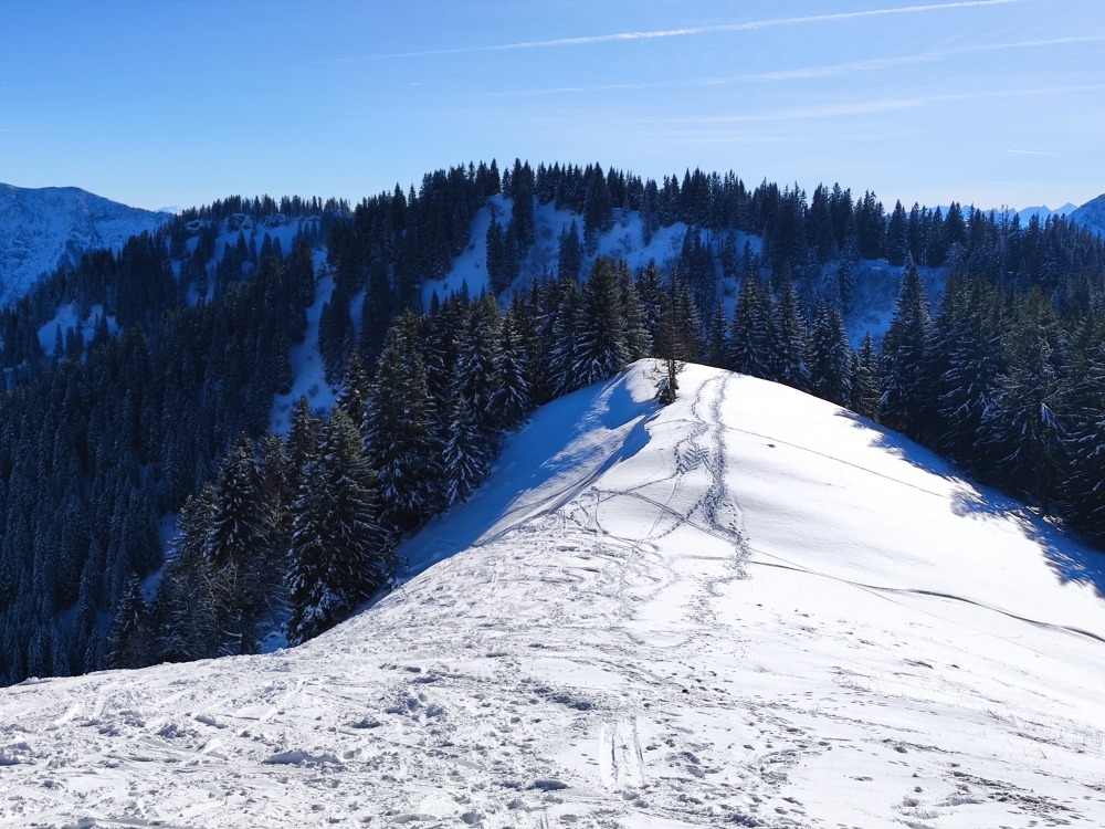 Gerade weiter treten wir aus dem Wald uns sehen das Gipfelkreuz auf dem Roßkopf.