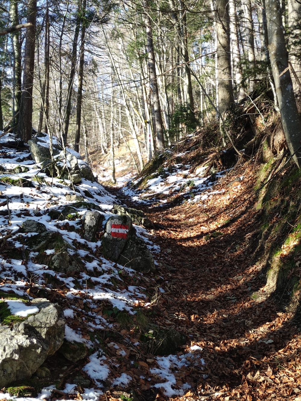 Bei einem Wegweiser gehen wir links auf einen nun schwerer erkennbaren Weg, der Wieder zu einer Forststraße führt und dann wieder schmäler zurück zum Parkplatz führt.