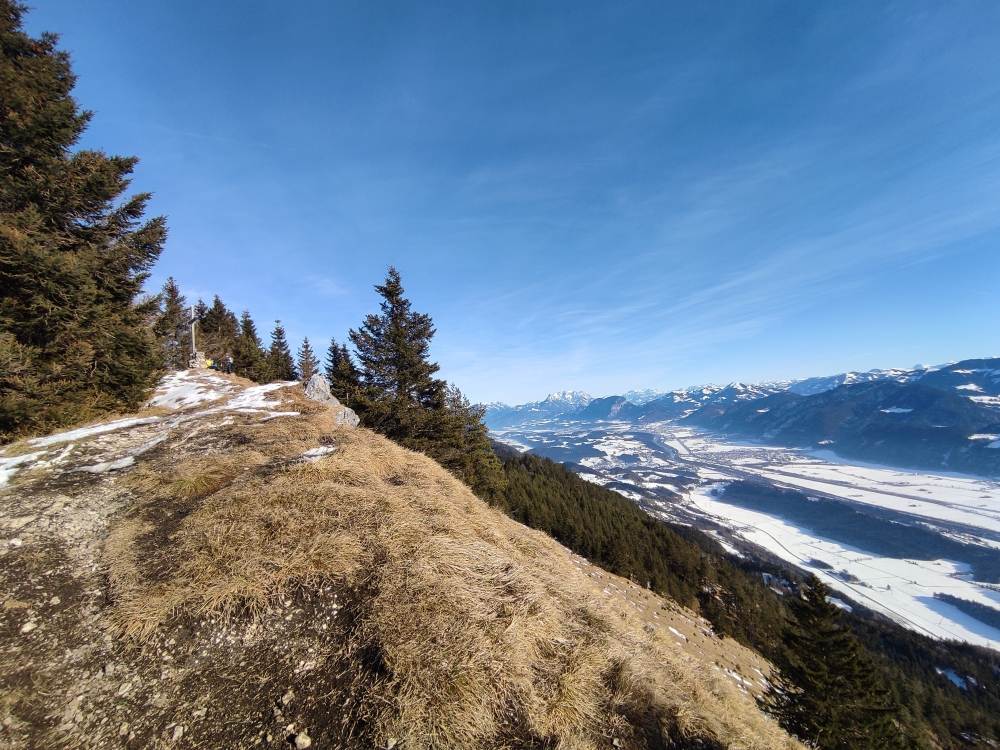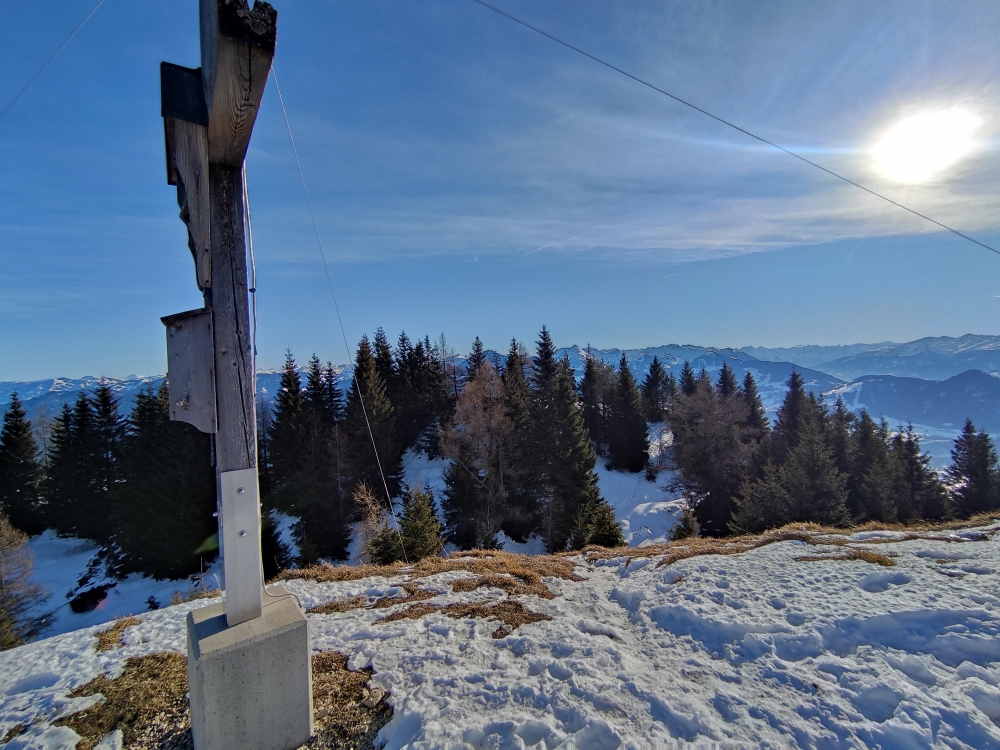 Rund 900 Höhenmeter und zweieinhalb Stunden später stehen wir am Gipfekreuz hoch über dem Inntal und blicken von Kaiser im Osten über das Alpbahtal im Süden bis zu den Rofangipfeln im Osten.
